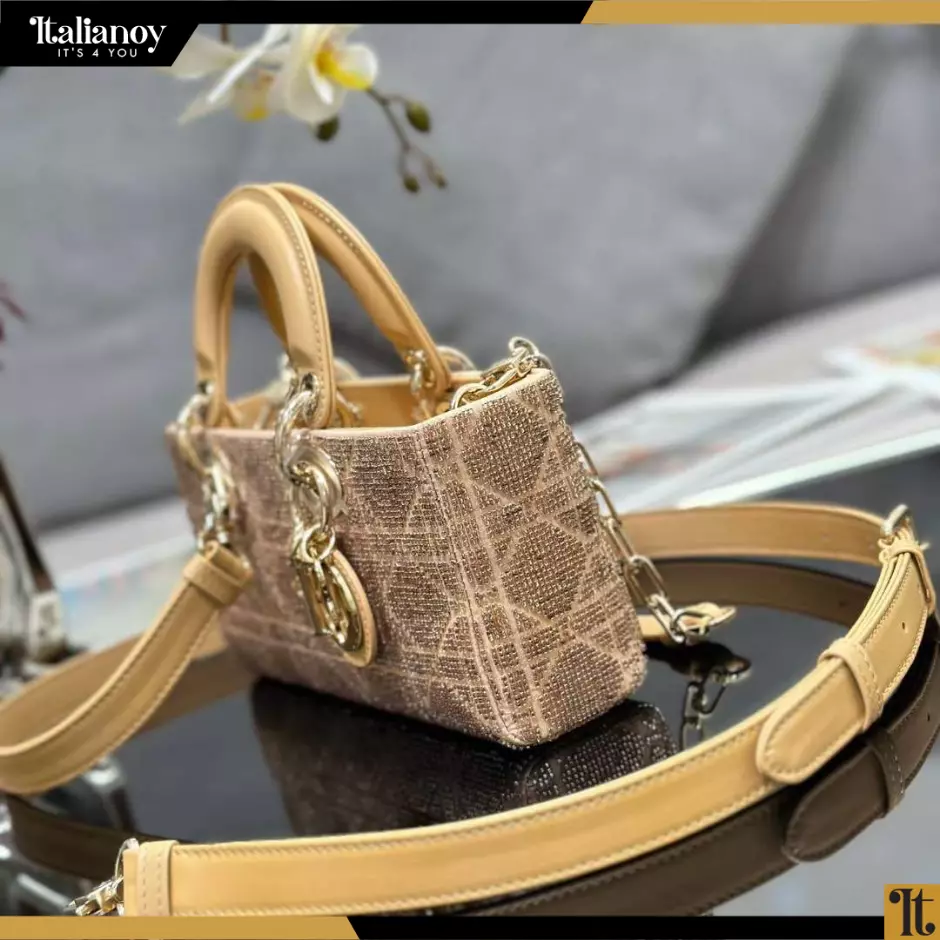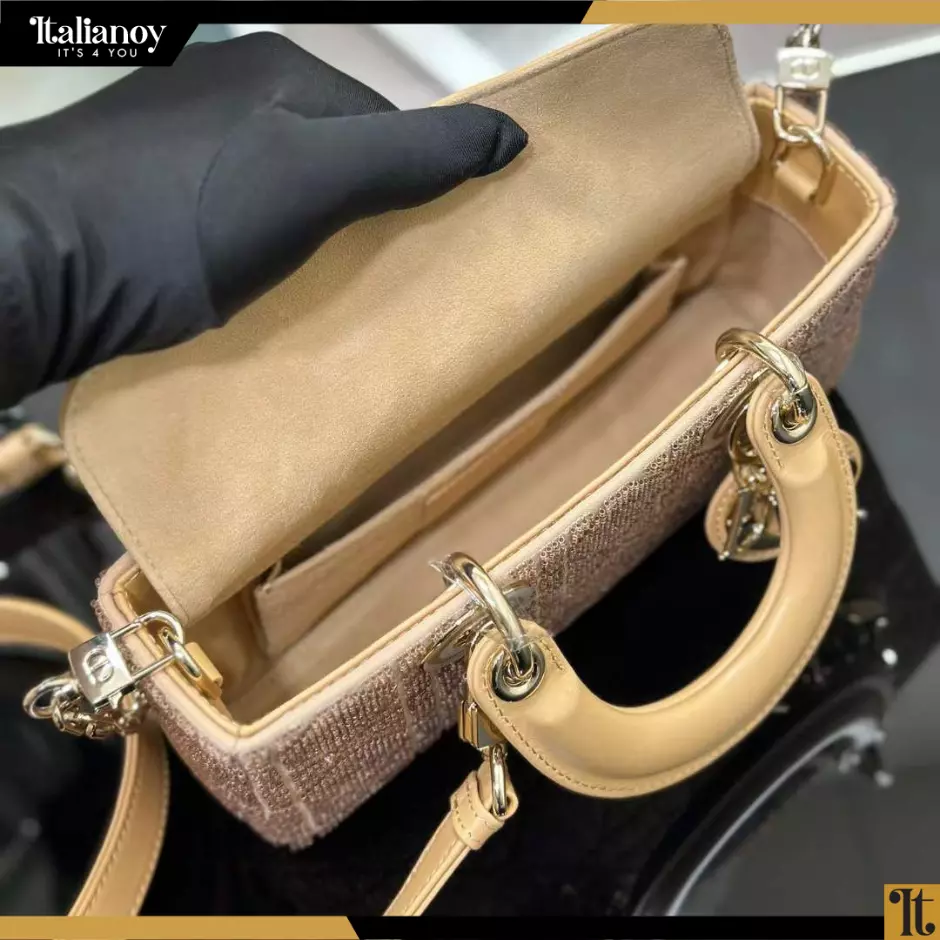 SMALL LADY D-JOY BAG Caramel Beige Cannage Cotton Embroidered with Micropearls