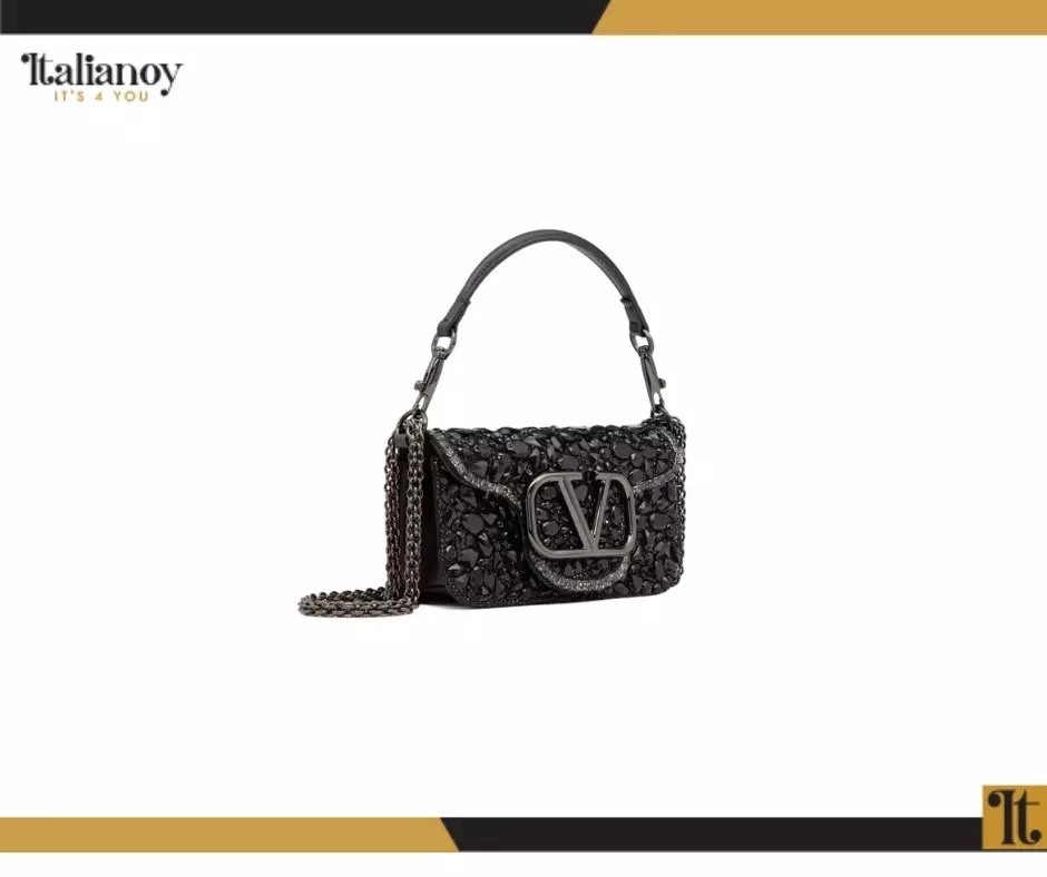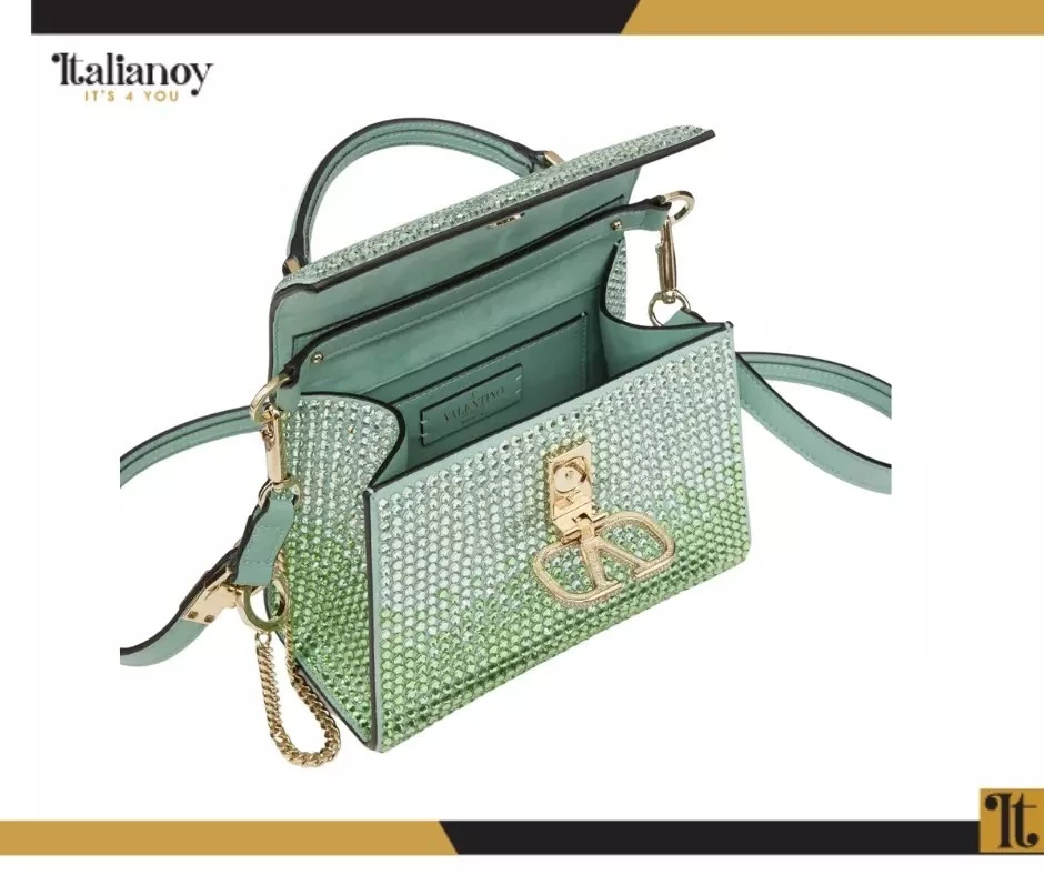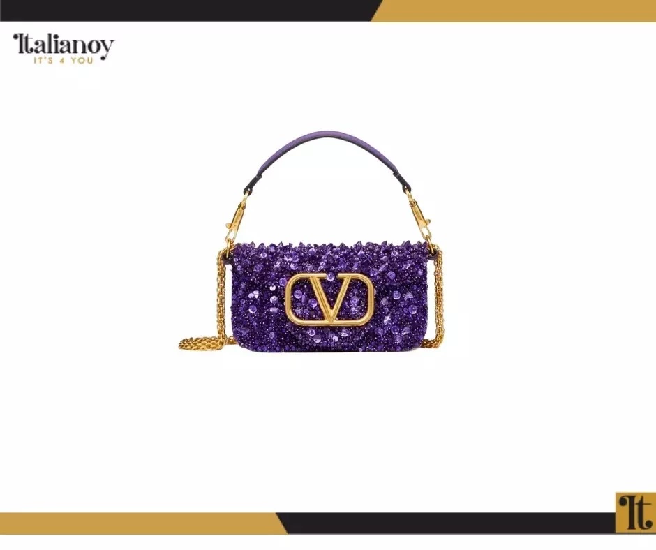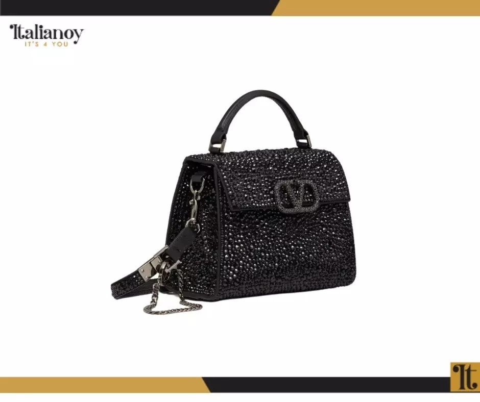 Made of shiny calf leather with an iconic V logo and crystal embellishments.