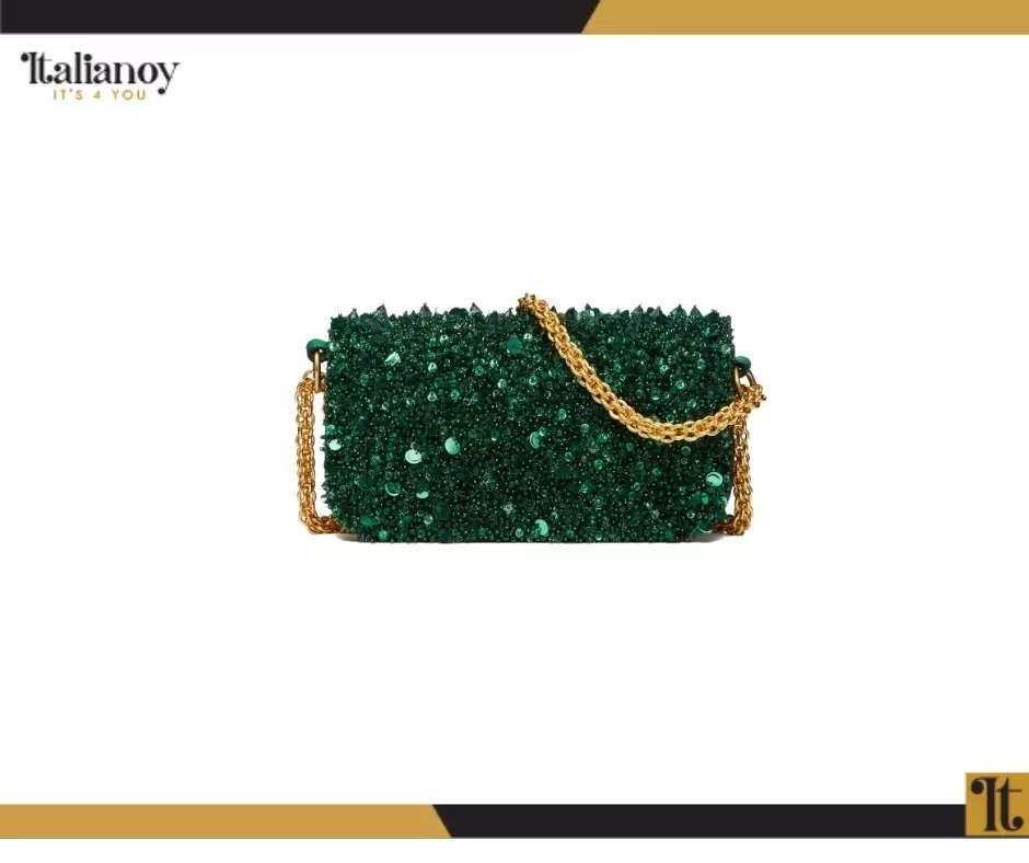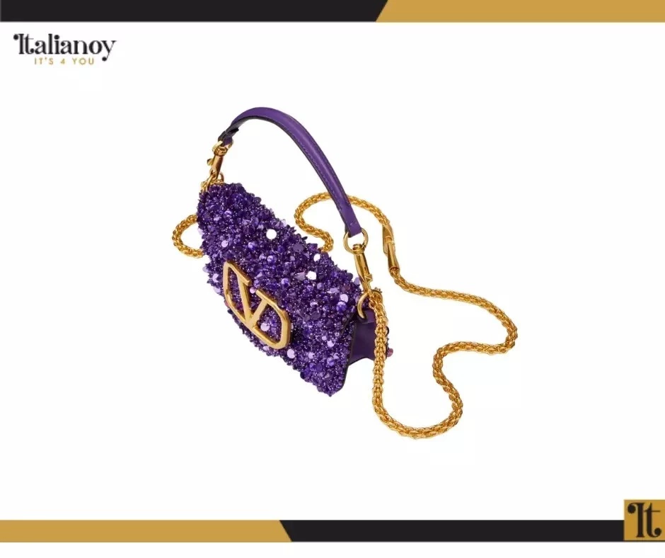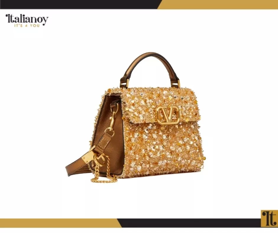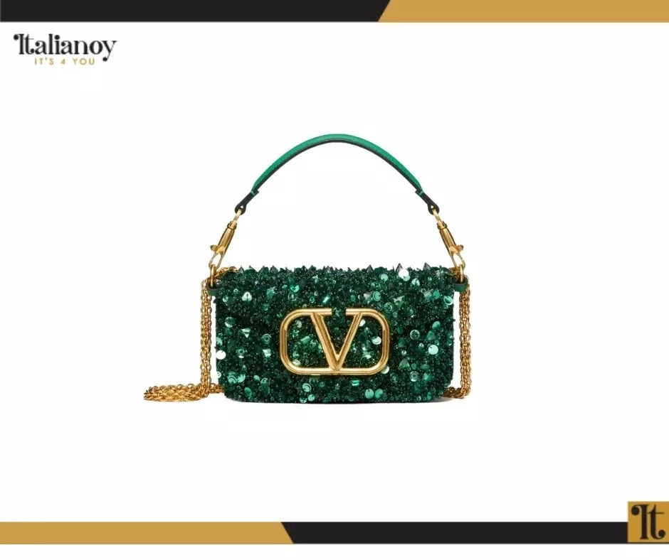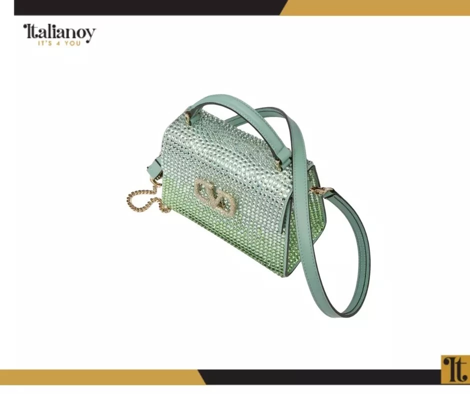 Made of shiny calf leather with an iconic V logo and crystal embellishments.